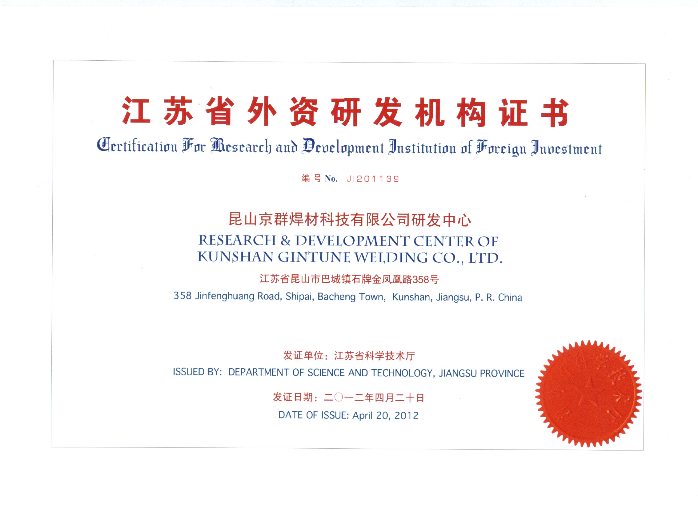 Foreign R & D Institutions Certificate